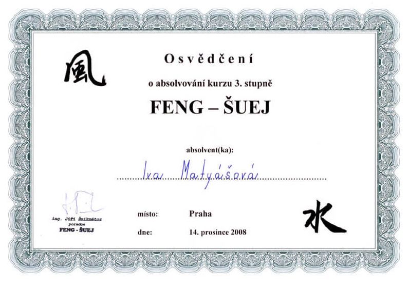 Disponuji certifikáty ze seminářů Školy tvaru a kompasu, Školy Ba-Gua a pěti prvků, intuitivního Feng Shui a energie čchi.
