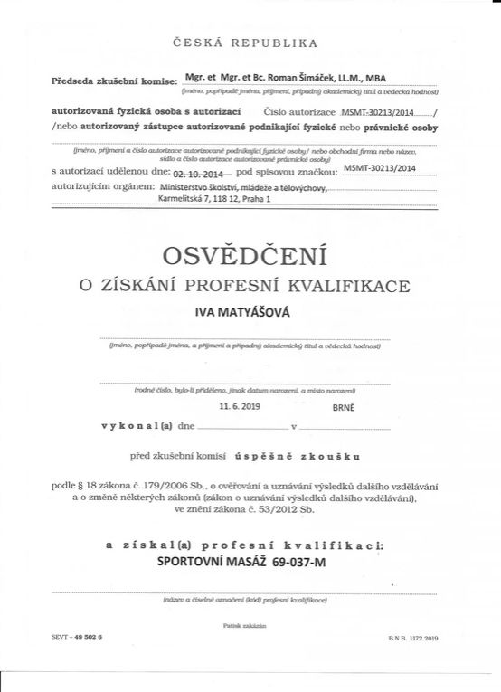 V roce 2019 jsem získala profesní kvalifikaci sportovní masáže od ministerstva školství, mládeže a tělovýchovy v Praze pod spisovou značkou MSMT – 30213/2014.