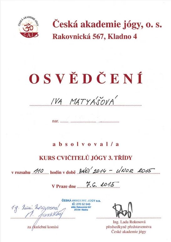 Jsem absolventkou trenérské školy jógy Č.A.J., z.s., která spolupracuje s Karlovou Univerzitou – Fakultou tělesné výchovy a sportu a s Filosofickou fakultou v Praze. Jedná se o tradiční jógu směřující k sebepoznání a osobnímu růstu.